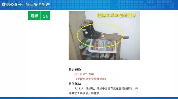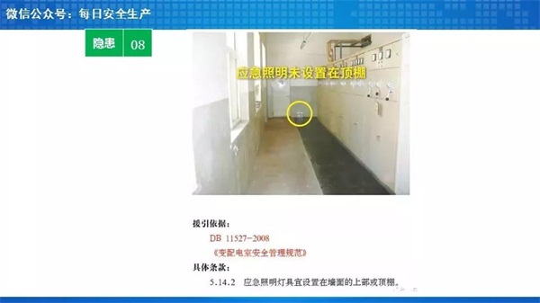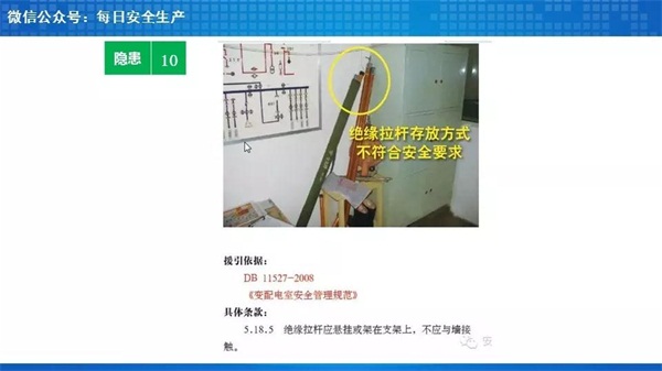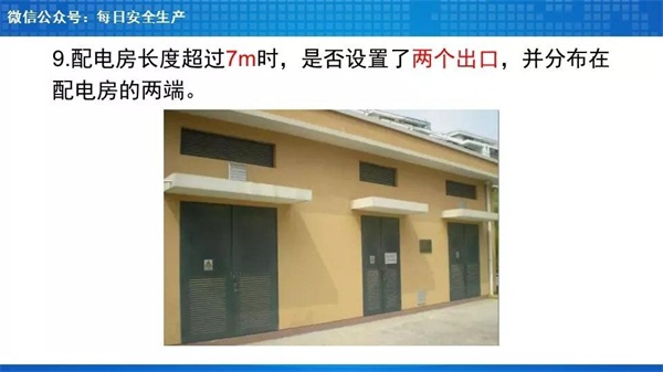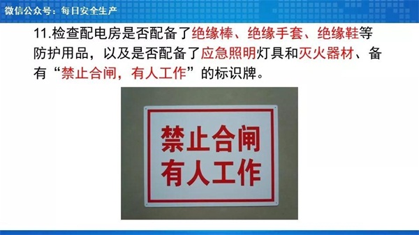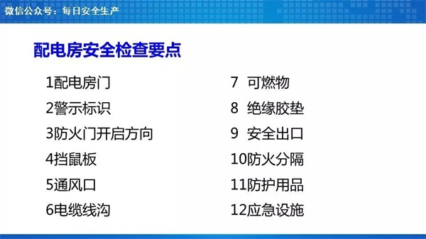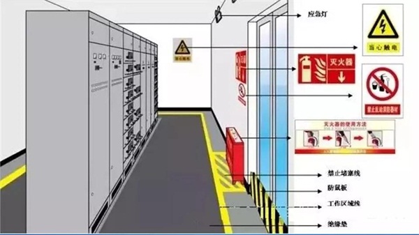 安全警示标识、地面划线、火灾报警系统、灭火器(一般用CO2的,变压器处使用干粉的)、挡鼠板、绝缘垫、绝缘手套、绝缘靴、防护头盔、高低压摇表、验电器、绝缘拉杆等,其中后几项防护、安全用品一般可以集中配置在值班室内,由操作人员携带或穿戴前往配电室进行专业操作。